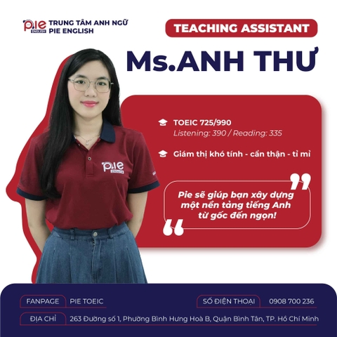 Chị Anh Thư đạt 745 điểm trong bài thi TOEIC. Khác với các chị trợ giảng khác, chị Thư nổi tiếng là “giám thị khó tính” của nhà PIE vì sự nghiêm khắc, kỷ luật và tỉ mỉ trong công việc. Chị Thư rất siêng soạn nhiều game hay ho để khảo bài các bạn học viên, nhưng cũng sẽ không ngại khiển trách nếu có bạn nào mất tập trung trong lớp. Học viên nhà PIE vừa sợ, mà vừa nể chị Thư lắm đó!