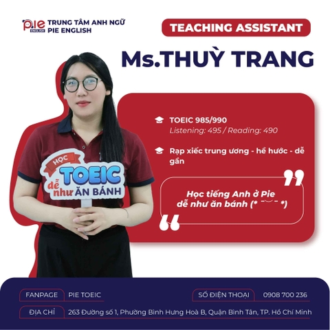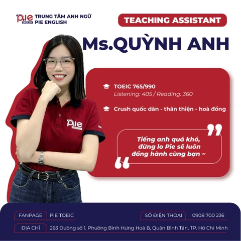 Chị Quỳnh Anh đạt 760 điểm trong bài thi TOEIC. Chị Quỳnh Anh là “crush quốc dân” của nhà PIE vì vẻ ngoài xinh xắn, tính cách thì hoà đồng, dễ thương, lúc nào cũng cười tươi vui vẻ với các bạn học viên. Chị Quỳnh Anh còn rất kiên nhẫn hướng dẫn bài tập cho đến khi nào các bạn hiểu bài mới thôi. Học viên nhà PIE mê chị Quỳnh Anh tới mức xem chị như người bạn thân thiết, ngoài giờ học rủ rê nhau đi cà hê chụp ảnh hoài luôn!