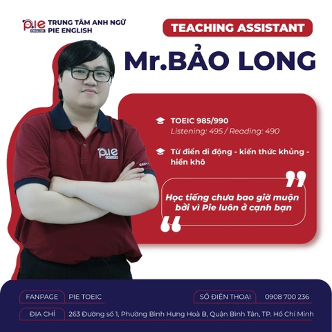 Bảo Long xuất sắc đạt 985 điểm trong kì thi TOEIC. Với tính cách hiền hoà, thân thiện, cách hướng dẫn bài tập chậm rãi, chi tiết. Ngoài ra, anh Long còn được gọi là “từ điển biết đi” vì từ vựng nào ảnh cũng biết và luôn tìm tòi những từ vựng nâng cao để hướng dẫn học viên, vậy nên các bạn lớp TOEIC Writing và lớp Nâng Cao rất quý mến anh Long.